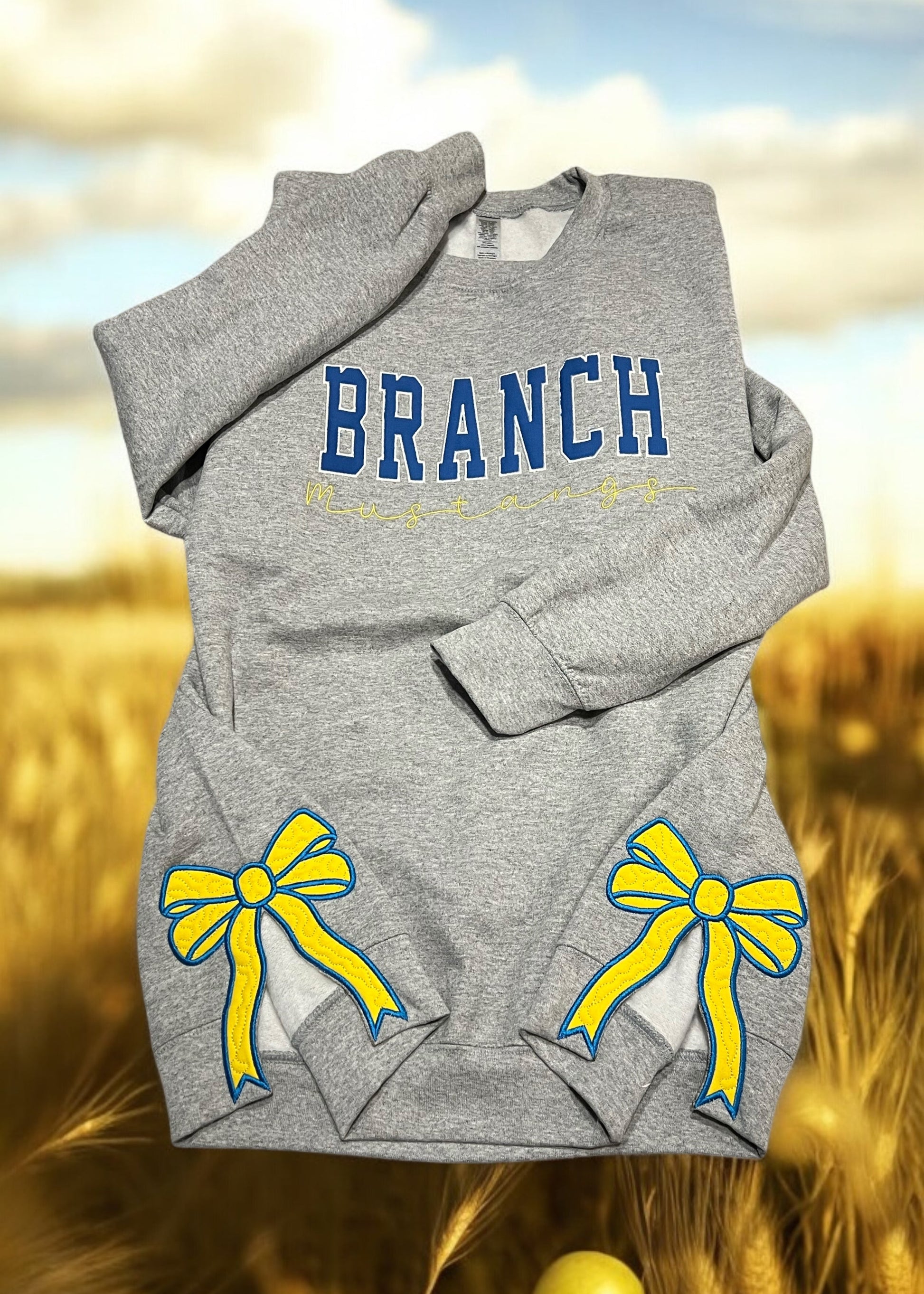 Show off your year-round school pride with a unique sweatshirt, designed for true Mustang fans! Featuring "BRANCH" in a striking blue applique and "Mustangs" in a bold yellow script, this sweatshirt boasts trending side bow cutouts in matching yellow and blue. It's the perfect blend of style, comfort, and school spiritโideal for campus events, casual outings, and everyday wear.